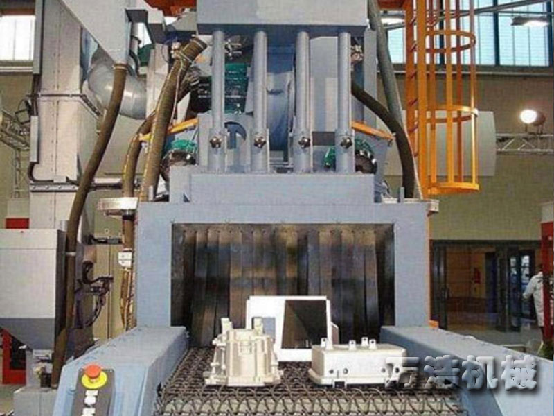 网带式抛丸机是由输送网带作为工件的承载体,传送网带又分为钢丝网带和耐磨橡胶带两种方式。抛丸室的一端为装件工位,另一端为卸件工位。工作时,在装件工位将零件置于传送带上,传送带缓缓连续进入抛丸室进行抛丸清理,接着送到卸件工位将工件取下。此机特点是:连续进行工作,无任何碰撞,中小件均适合,生产批量大。